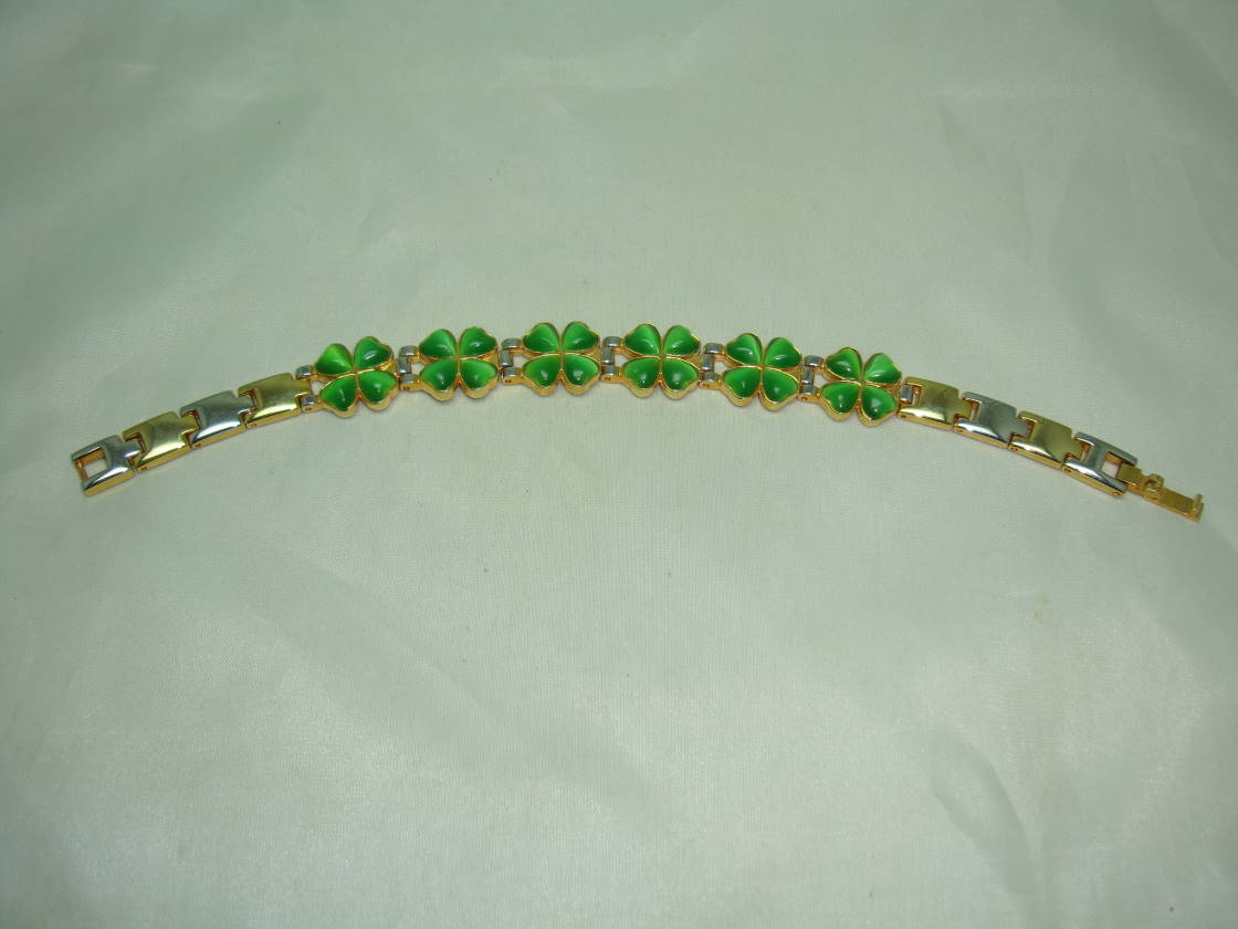 Green Glass Four Leaf Clover Goldtone and Silvertone Link Bracelet