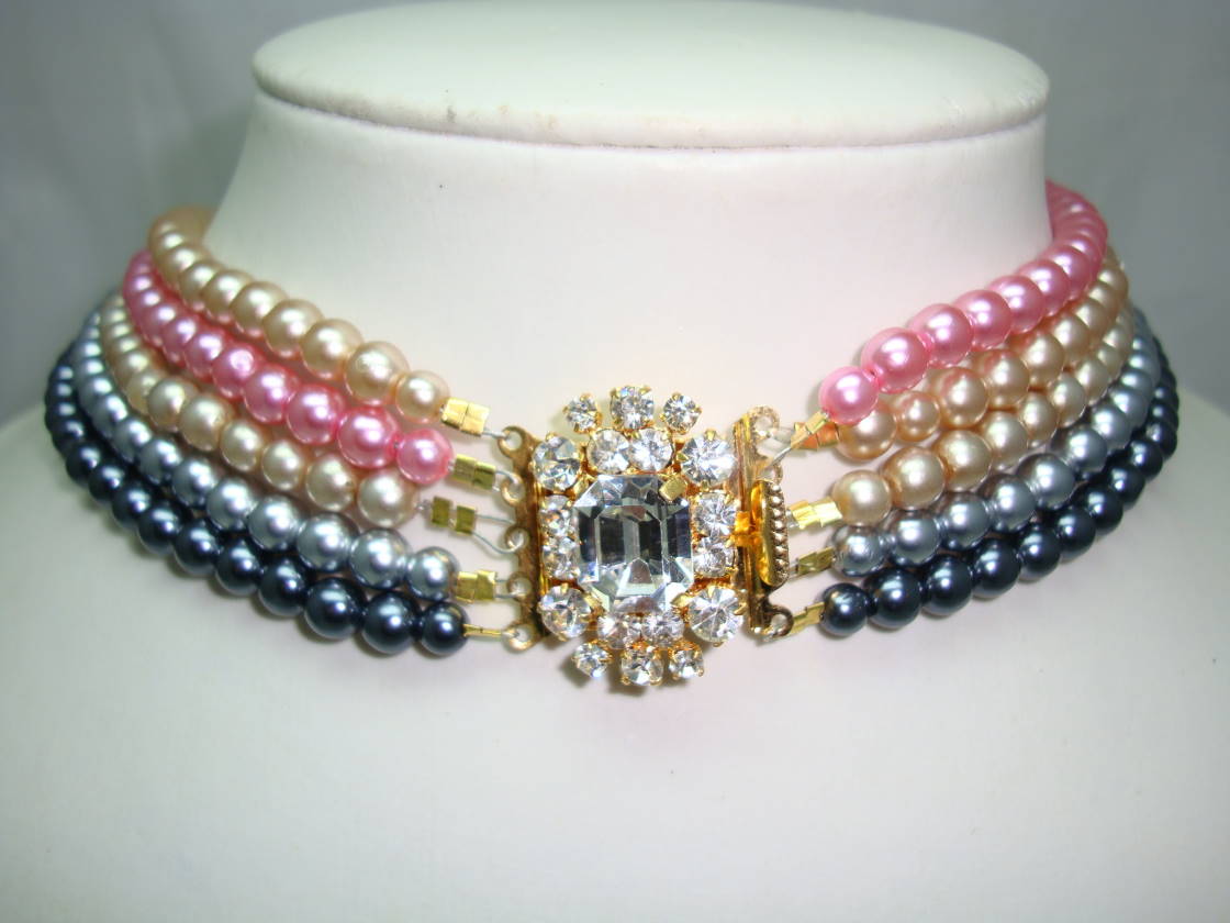 1950s 5 Row Multicoloured Pearl Necklace DIAMANTE CLASP