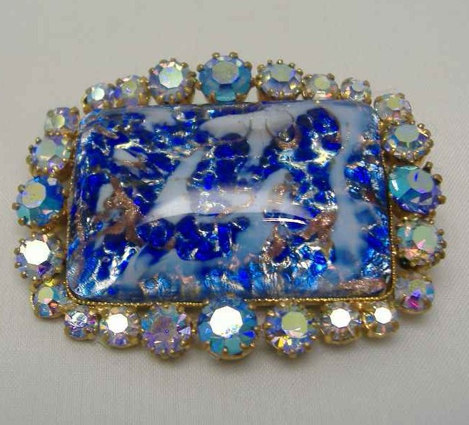 1950s BIG AB Diamante & Blue Gold Flecked Glass Brooch