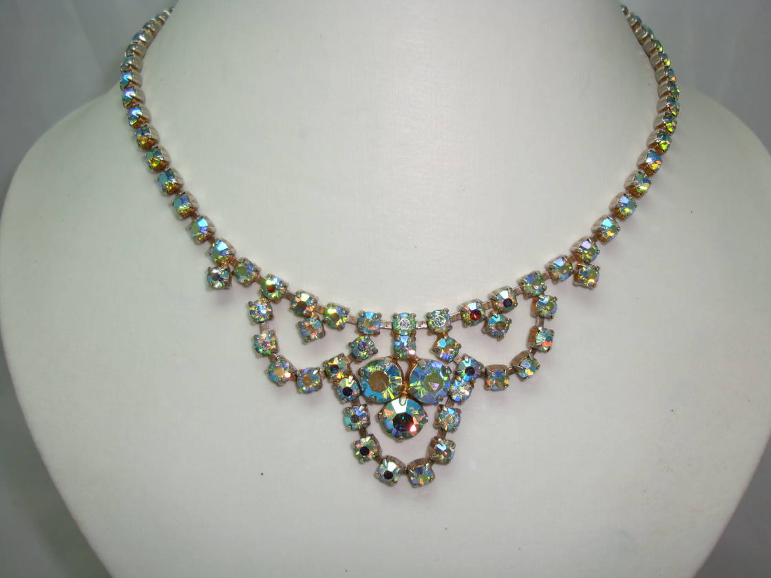We are pleased to offer this amazing vintage 1950s silvertone sparkling green/blue aurora borealis diamante cascade drop necklace which is just fab.  As you can see from the photos, the necklace is in very good vintage condition, great sparkle and shine from the ab diamantes -  this really is an amazing vintage piece - has loads of 50s glamour!