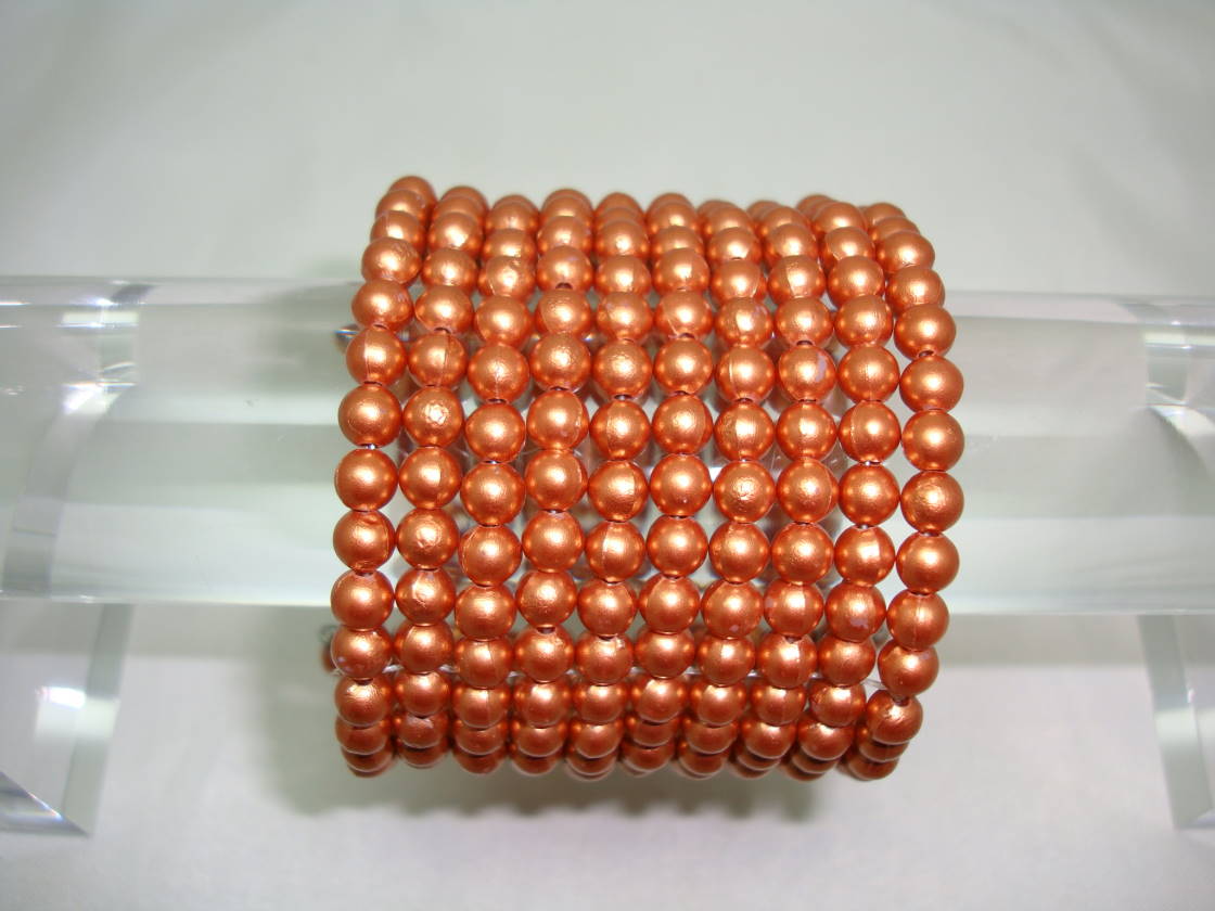 We are pleased to offer this vintage 1950s wide 10 row gold/bronze lucite/plastic faux pearl bead wired flexible bracelet which is just fab.  Excellent condition, will fit any wrist size as it is flexible, looks really great on, will go with practically anything.