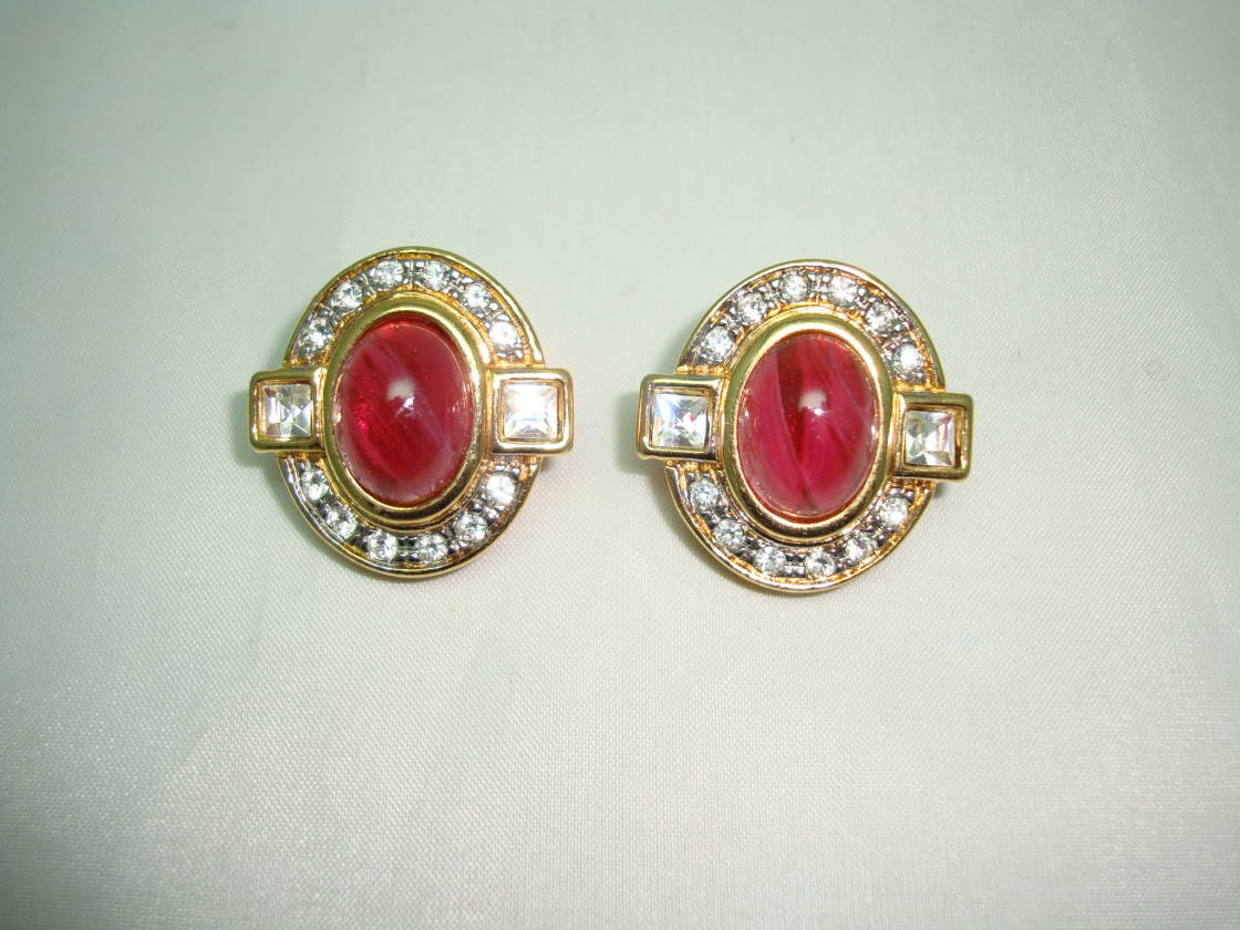 1980s Diamante and Red Cabochon Glass Clip On Gold Earrings - Quality