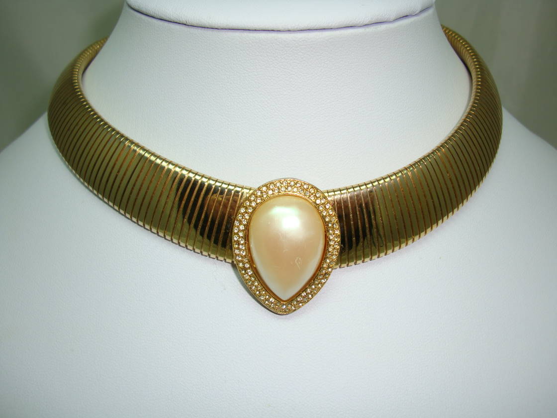 1980s Wide Flexible Faux Pearl Diamante Cleopatra Collar Gold Necklace