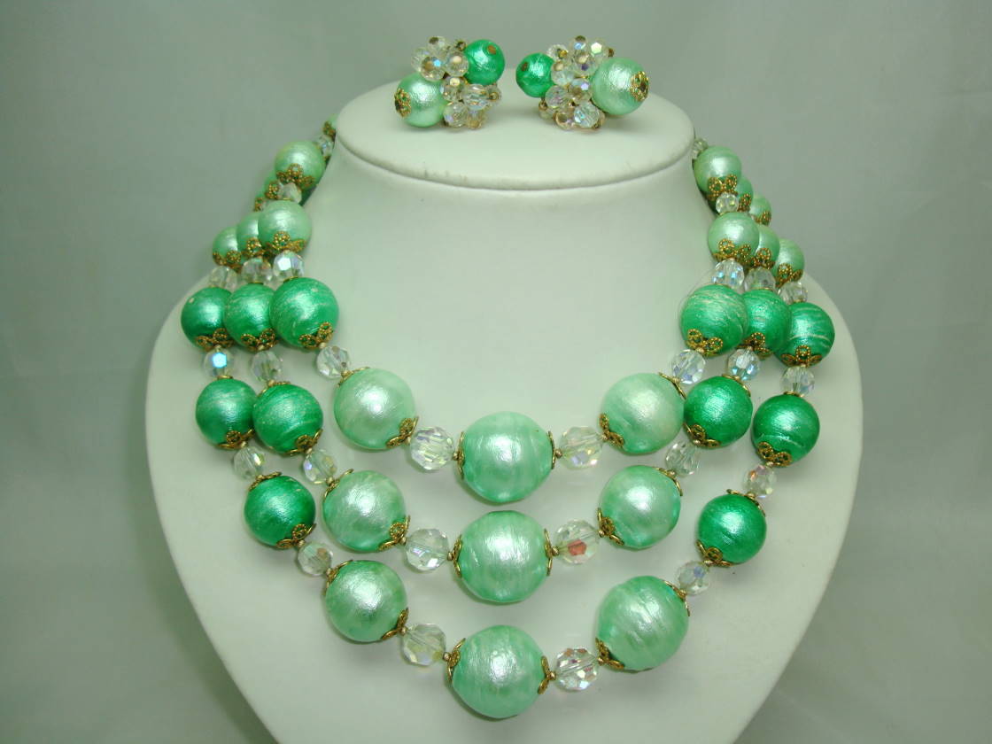 50s Signed Vendome 3 Row Green Pearl  Crystal Necklace and Earrings