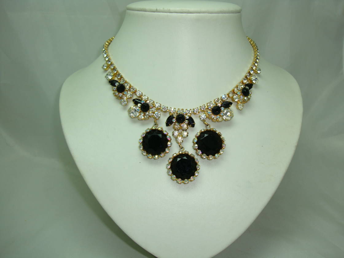 50s Spectacular AB Diamante Black Glass Stone Drop Elaborate Necklace