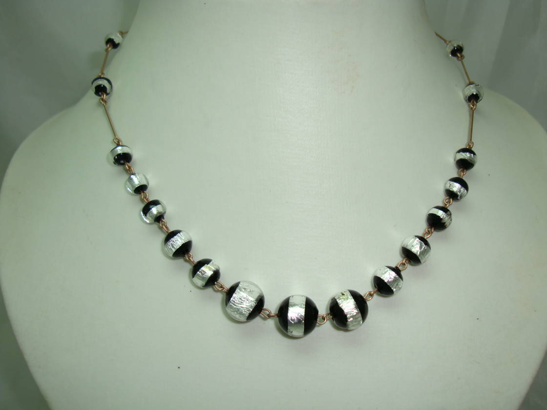 Art Deco Rolled Gold Link Black & Silver Foil Glass Bead Necklace