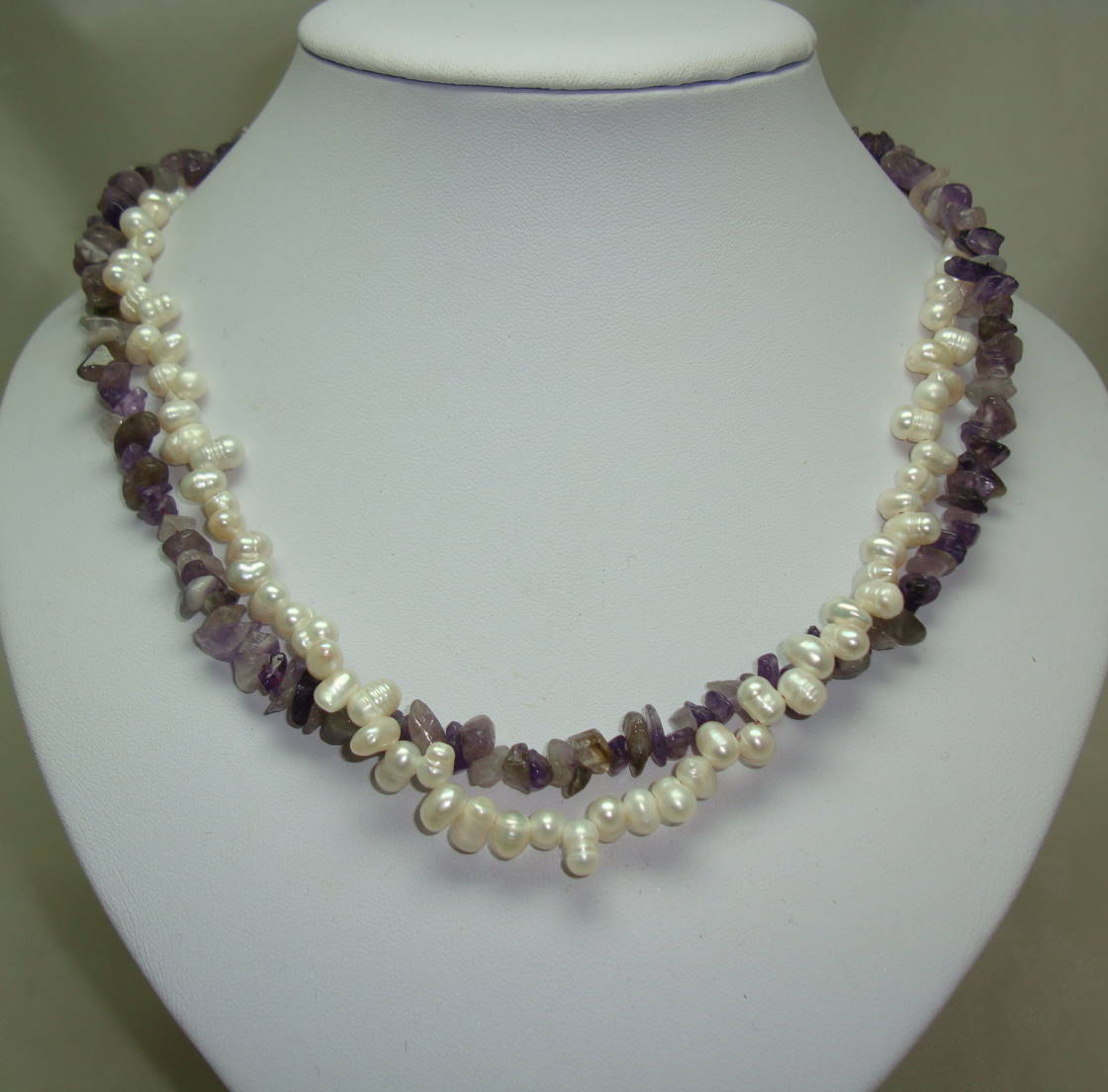 Beautiful Real Amethyst Bead and Freshwater Pearl Bead Twist Necklace