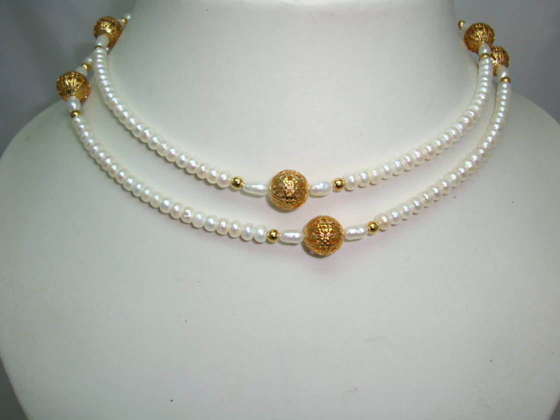 Beautiful Real Freshwater Pearl Bead Necklace with Gold Filigree Beads