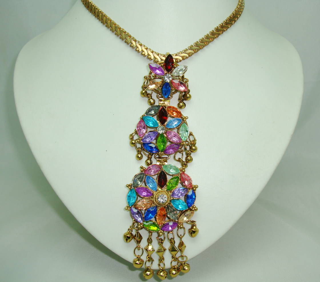 We are pleased to offer this fabulous bold Asian/Indian colourful graduating 3 circles flower dangle goldtone pendant made up of colourful lucite/plastic stones in a flower shape with the clear central stones being glass diamantes.  I have added a 20 inch slinky chain so it is ready to wear.  I love the beautiful array of colours on this one and the goldtone tassels, reminds me of the 60s flower power style, excellent condition, looks really unusual and unique.