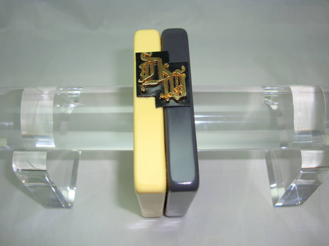 We are pleased to offer this fabulous Vintage 70s style heavy lucite/plastic square shaped double bangle in shades of grey and lemon.  This is a modern piece which has been customised with a genuine Donatella Versace goldtone and leather hardware insignia.  This is a one off piece so you will never see another one like it.  Looks absolutely stunning on, a real stunner - chunky, stylish and modern!  Excellent condition - a really weighty piece, well made and very, very unique!