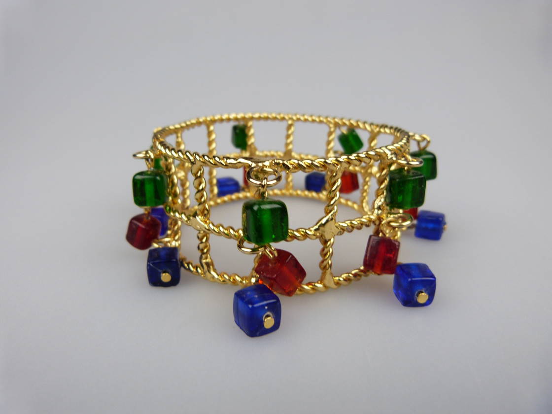 We are pleased to offer this fabulous vintage 1960s wide textured twist goldtone bracelet open weave style bangle/bracelet decorated with square glass red, green and blue glass dangle charms.  Excellent vintage condition, has a good weight to it, very well made and unique looking, looks super on, a real eye catcher!