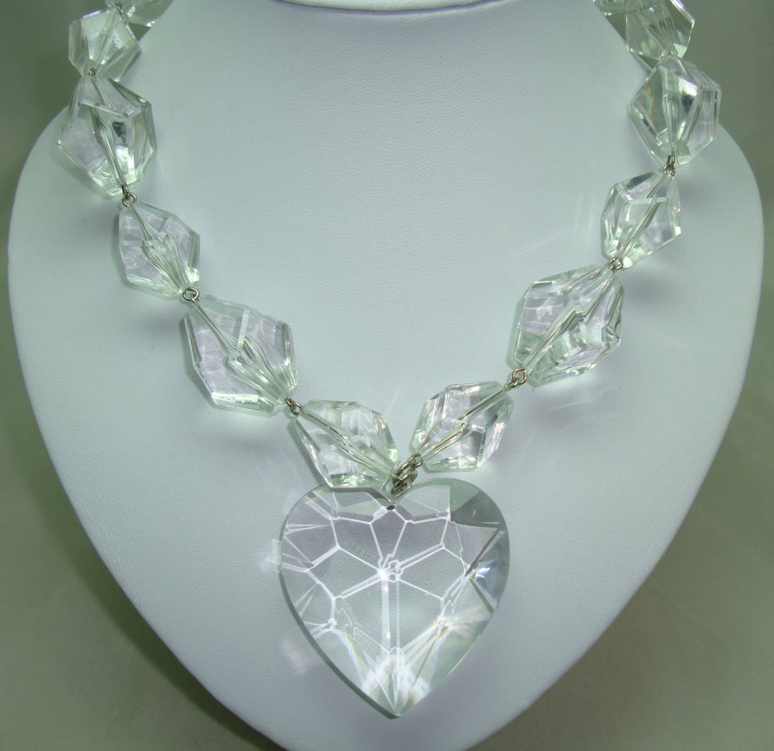 Fab Chunky Clear Lucite Acrylic Bead Necklace with Large Heart Pendant