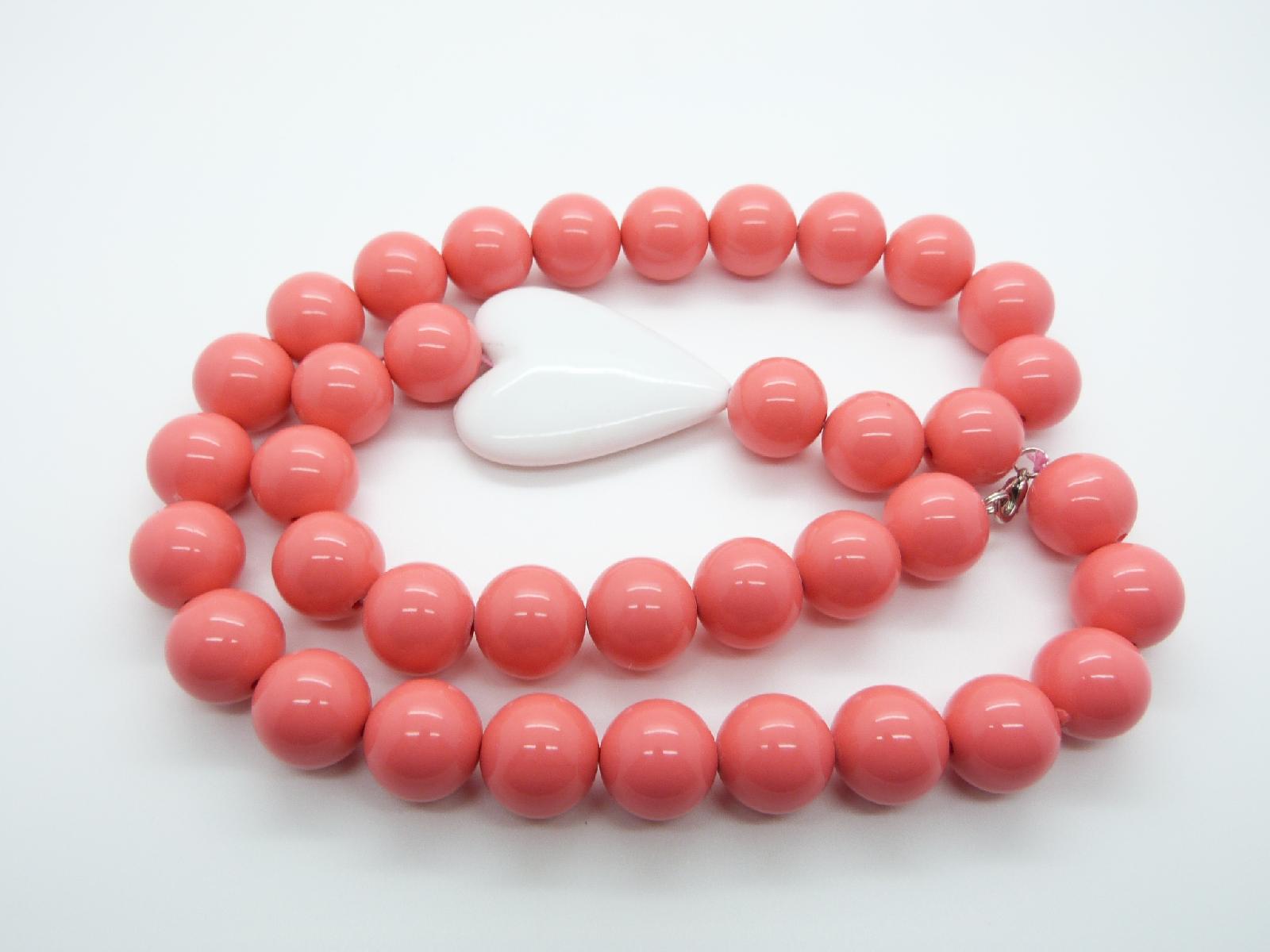 Fab Chunky Long Coral Plastic Bead Necklace Large White Heart Feature 84cms