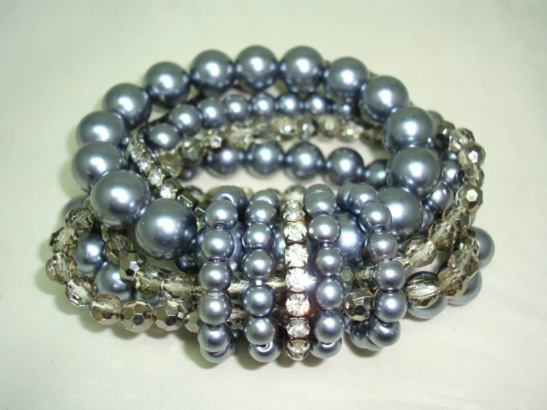 I am pleased to offer this fabulous new, modern 6 row grey glass faux pearl bead stretch bracelet which is just fab.  The bracelet consists of 3 rows of grey glass faux pearl beads in various sizes, interspersed with one row of diamante strand and two rows of lucite faceted grey beads.  The central features has a 4 rows of grey faux pearl beads and a diamante row wrapped around it.  Very unusual and unique, looks very classy on, very well made and good quality.