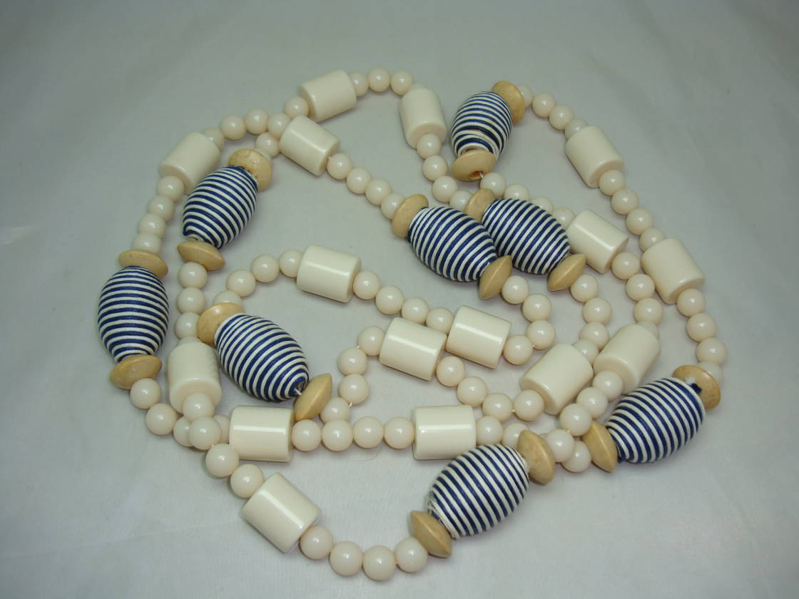 Fabulous cream lucite/[plastic contemporary chunky necklace interspersed with wooden beads and navy and white beads which are made up of thin spiralling strands of braid.  Excellent condition as necklace is a modern, new piece.  Great length at 62 inches so you can double up or even treble up for different looks.  Very versatile and eye catching, well made and a good weight to this one as well.