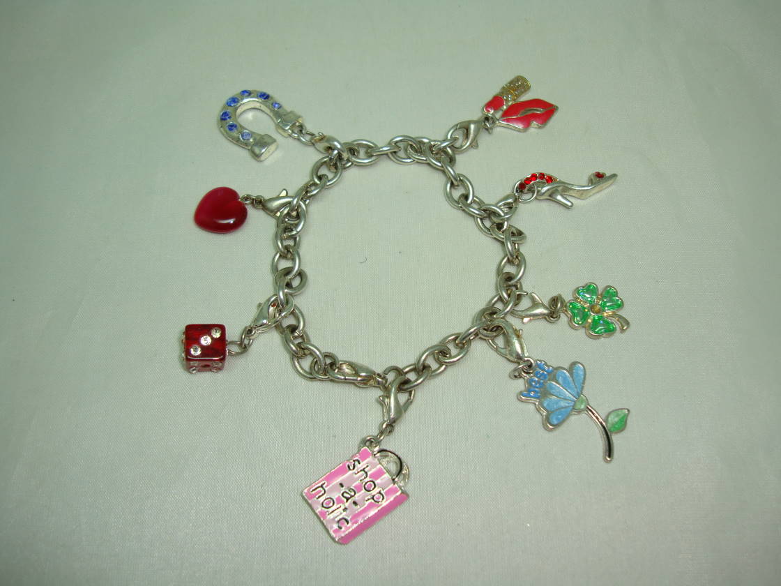 Lovely silvertone charm bracelet with 8 pretty enamel, lucite and diamante novel charms - lucky horse shoe charm decorated with sparkling blue diamantes, red lucite heart charm, red lucite dice charm decorated with sparkling diamantes, pretty pink enamel shopping bag charm, blue enamel flower charm, green four leaf clover enamel charm, silvertone shoe charm studded with sparkling red diamantes and a lipstick and lips red enamel charm.  All charms can be detached as they are secured with a lobster claw clasp so you can move them around.  Excellent condition as charm bracelet is new, good weight and well made, looks super on.