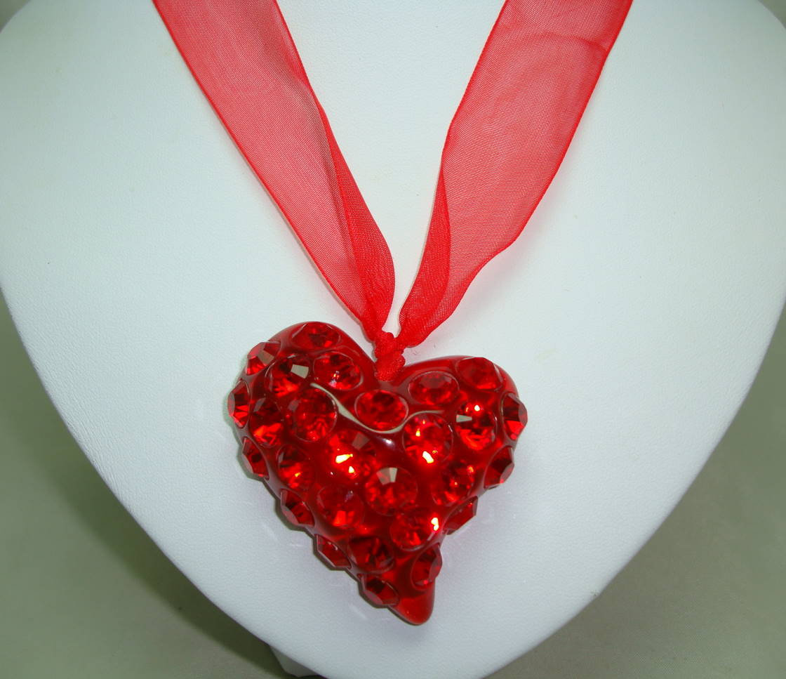 Large Red Acrylic Heart Sparkling Crystal Glass Pendant on Ribbon Tie