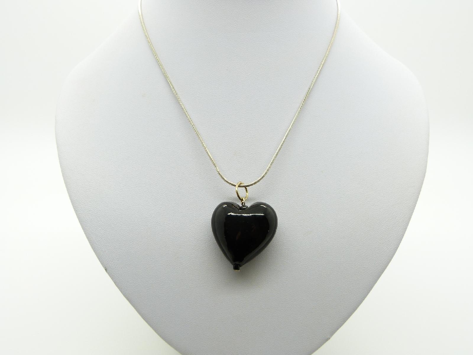 Pretty Black Glass Heart Pendant with Silvertone Snake Chain