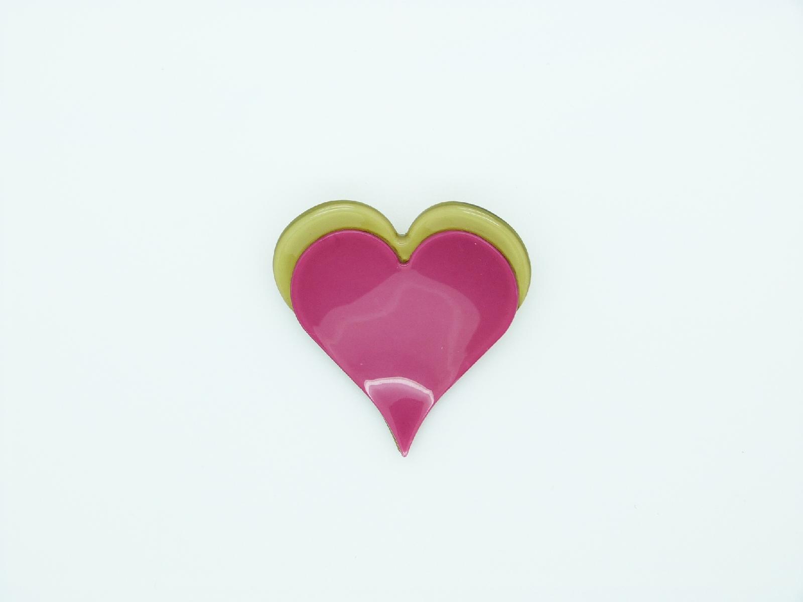 Brand new pink and green double heart style acrylic brooch, roll over clasp fastening, mint condition, looks super on, fun and quirky, measures 5cms across.