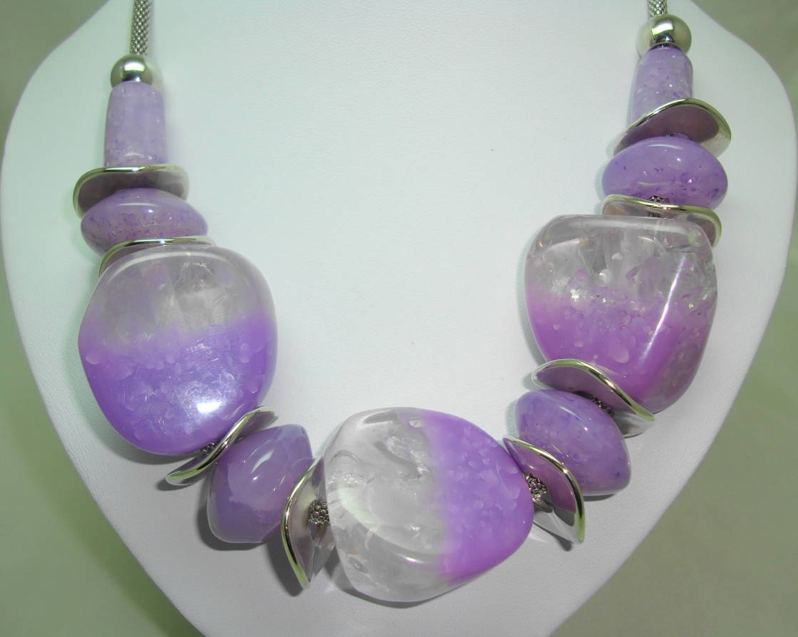Stunning Chunky Purple and Clear Lucite Bead and Silver Disc Necklace