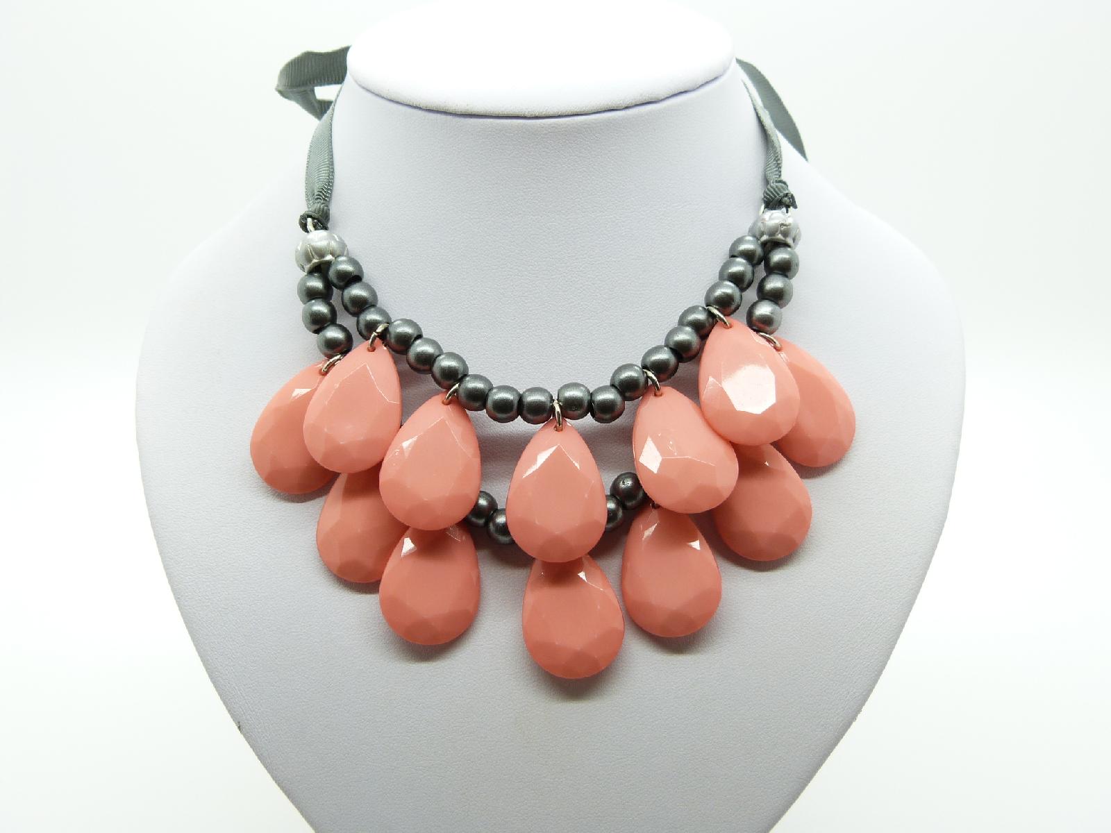 Stunning Orange and Grey Bead Double Row Dropper Necklace Grey Ribbon Tie