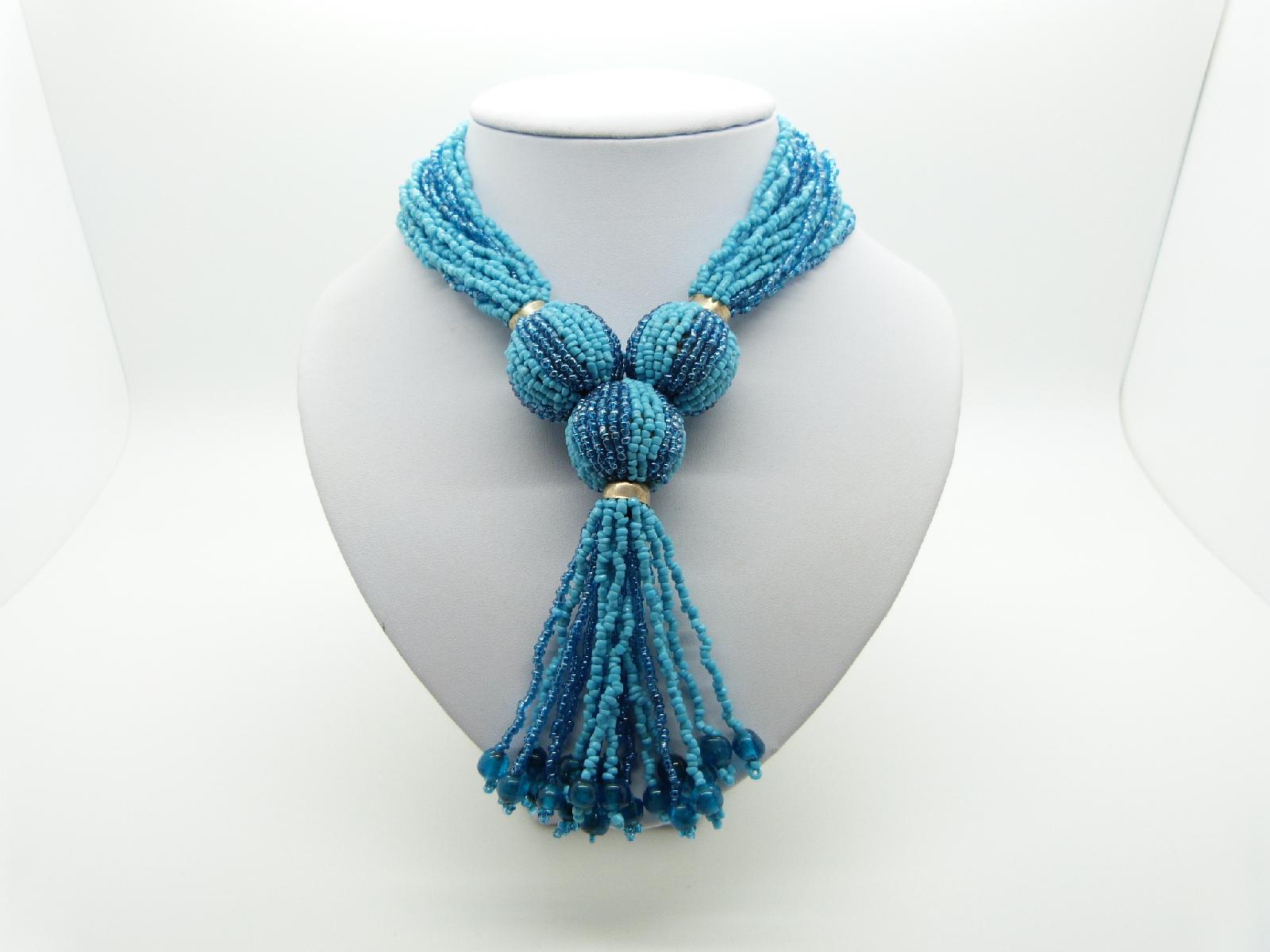Stunning Turquoise Glass Seed Bead Multi Strand Tassel Statement Necklace