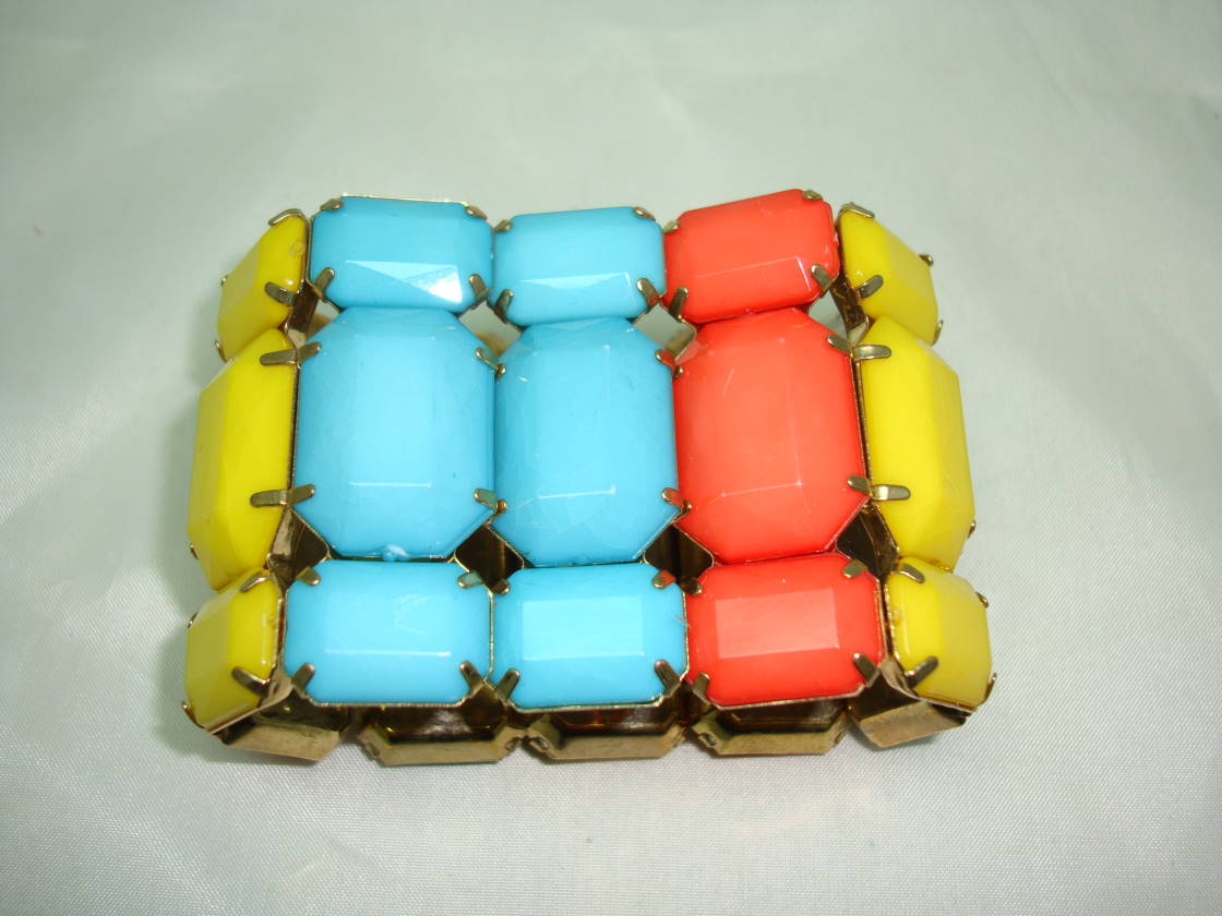 Fabulous wide yellow, orange and blue acrylic/lucite faceted stretch goldtone cuff bracelet.  Excellent condition, looks really attractive on, a real statement piece.
