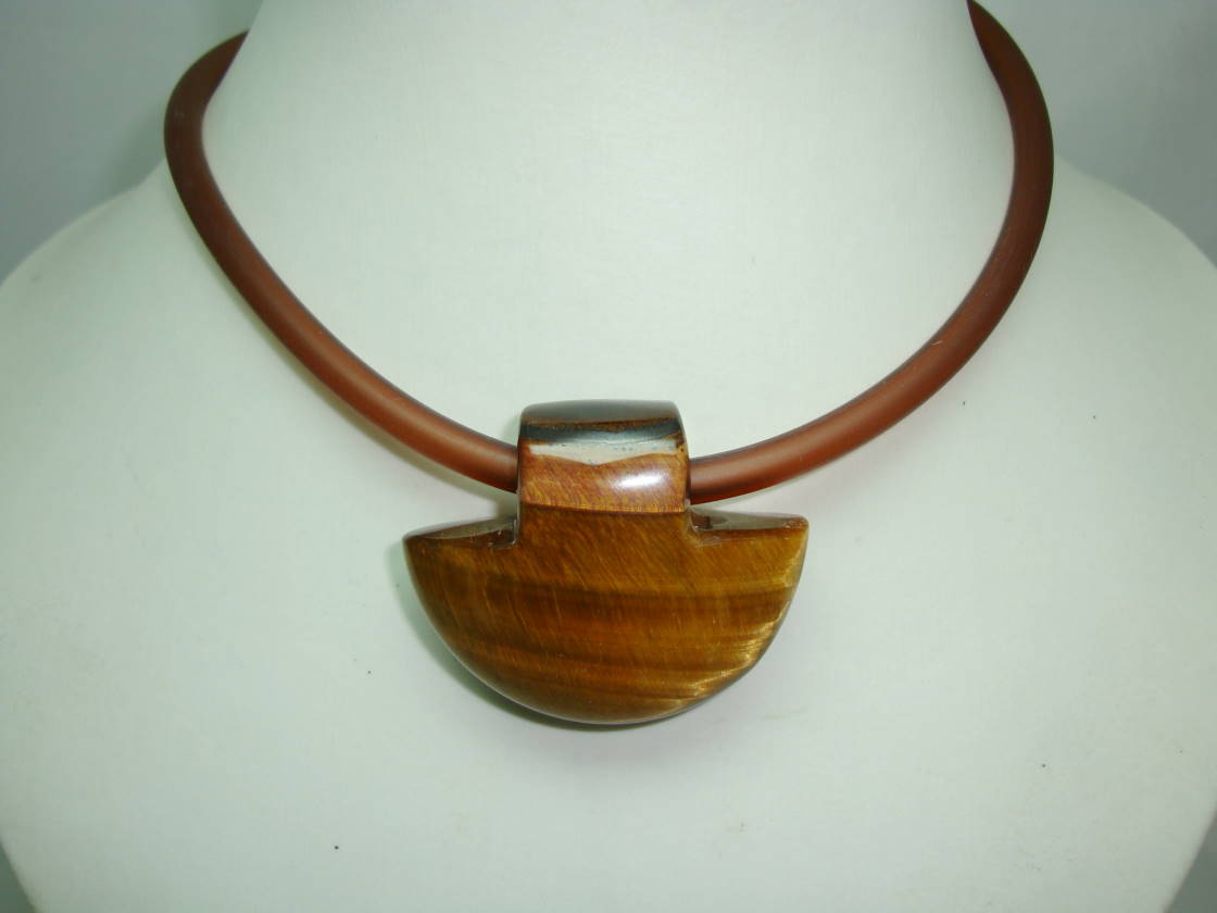 We are pleased to offer this very unusual contemporary chunky real tigers eye pendant on flexible rubber collar necklace.  Very well made, very stylish and unique, excellent condition, a real eye catcher!
