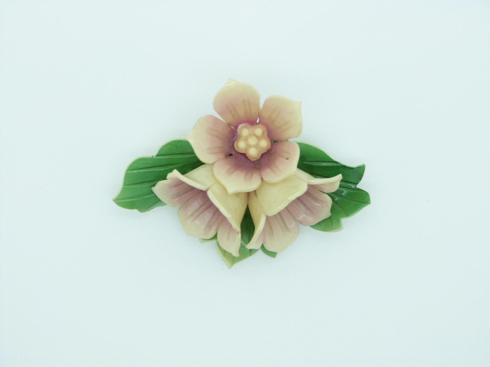 Vintage 1930's Art Deco Large Early Plastic Cream and Pink Flower Pin Brooch, three dimensional flowers with loads of wonderful detail, this is a large brooch measuring 6.5cms across.  Excellent vintage condition!