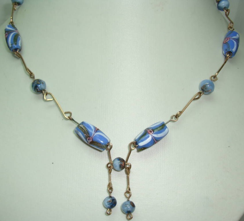 We are pleased to offer this beautiful vintage 1930s Art Deco rolled gold link Venetian wedding cake glass bead necklace in this gorgeous shade of  blue decorated with pink flowers with white and gold swirls.  Excellent vintage condition, fastens with  a shepherd's hook and loop fastener. The beautiful Venetian glass beads vary in size and shape with 2 tassel drops in the centre.   A beautiful vintage wedding cake necklace perfect for everyday wear!