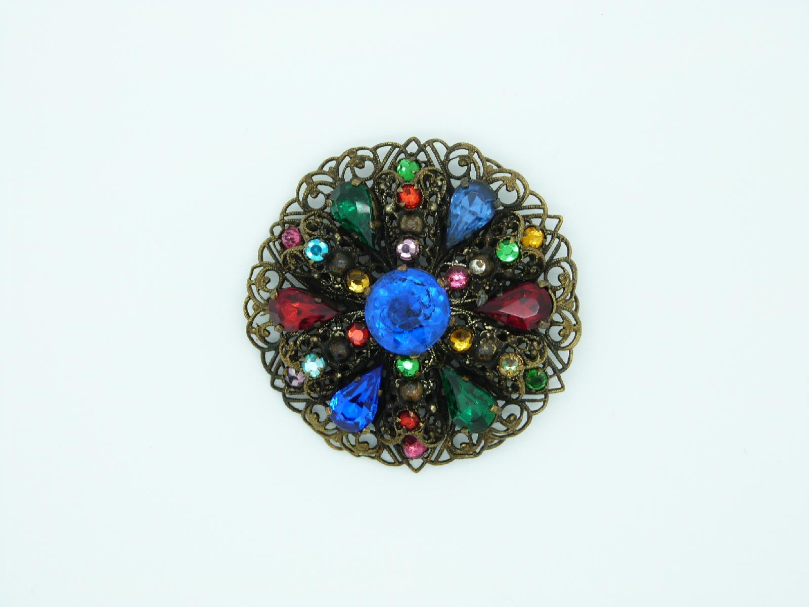Vintage 30s Czech Filigree Round Multicoloured Diamante Paste Brooch