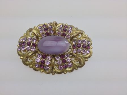 Vintage 30s Large Czech Filigree Purple Pink Diamante Oval Gold Brooch 7cm