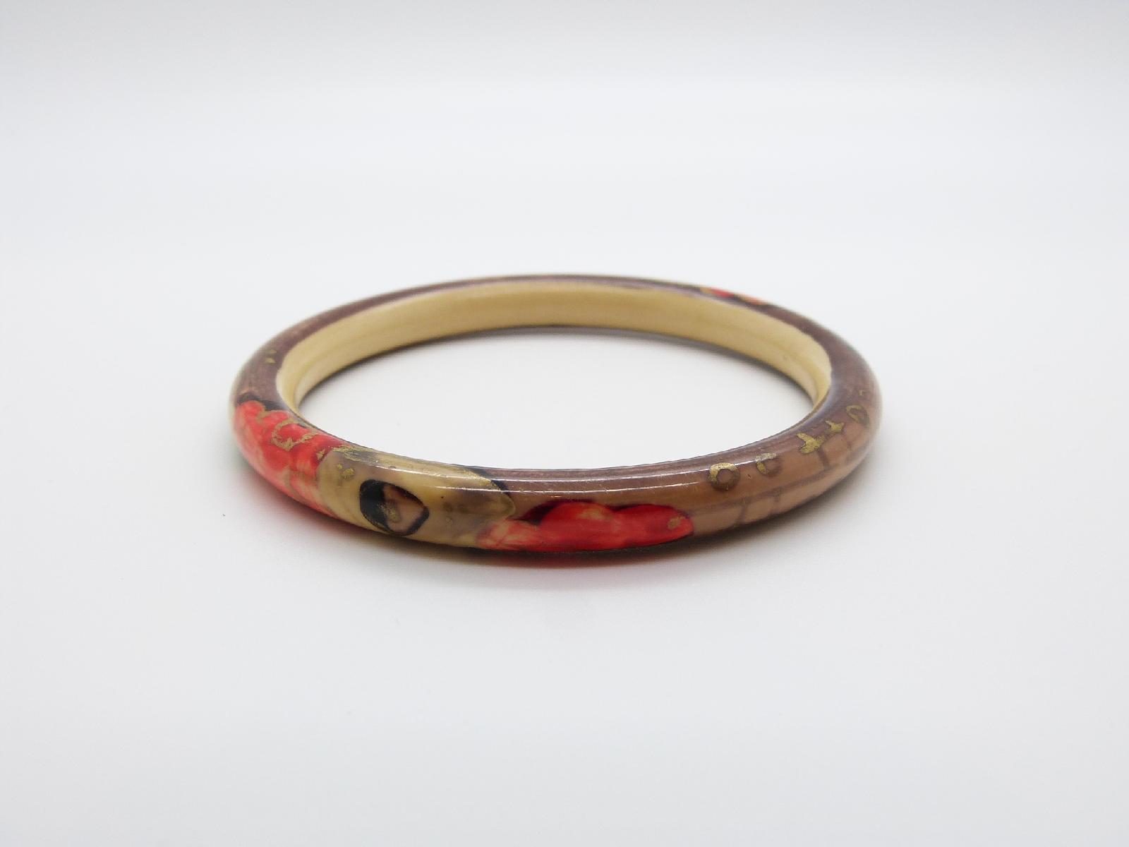 Vintage 1930s very unusual red, brown, cream and gold floral design celluloid/plastic armlet flapper bangle, excellent condition, looks stunning on, very unique and unusual, measures 20cms in circumference.  This is probably French in manufacture, a truly stunning piece! Flapper bangles or bracelets are a piece of Jazz Age jewellery! Worn above the elbow back in the roaring 20s/30s.