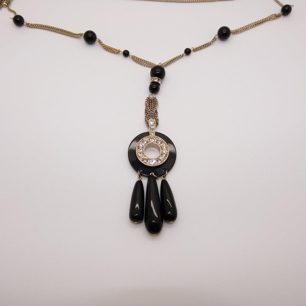 Fab vintage 30s style black glass bead and diamante pendant tassel goldtone chain necklace. Looks stunning on, will go with practically anything. Great condition, fastens with lobster claw clasp and comes with extender chain for extra length. Measurement includes extender and tassel pendant