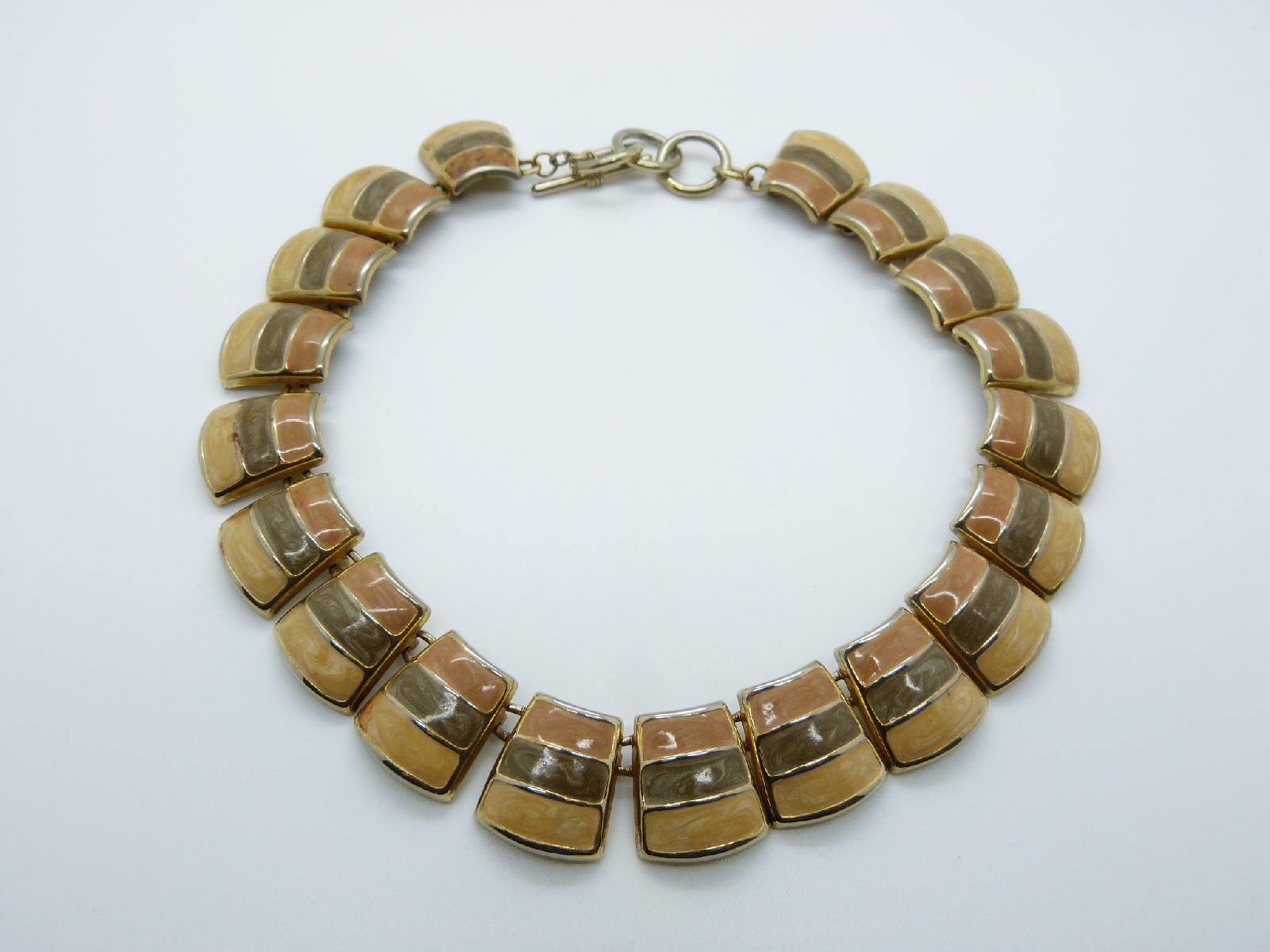 Vintage 1930s Art Deco wide three colour enamel goldtone collar necklace made of soft olive green, orange and mustard yellow.  Excellent condition, fastens with toggle clasp, looks very attractive on, measures 41cms in length, 2cms in width.