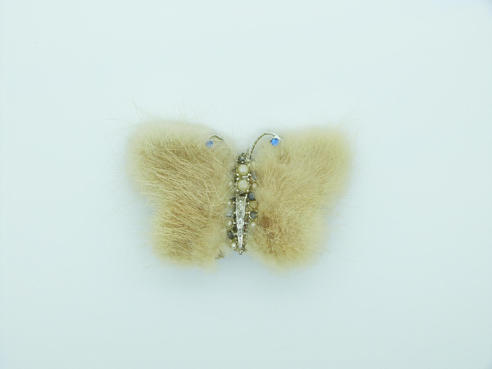 Vintage 40s Real Blonde Mink Butterfly Brooch Faux Pearls and Diamante