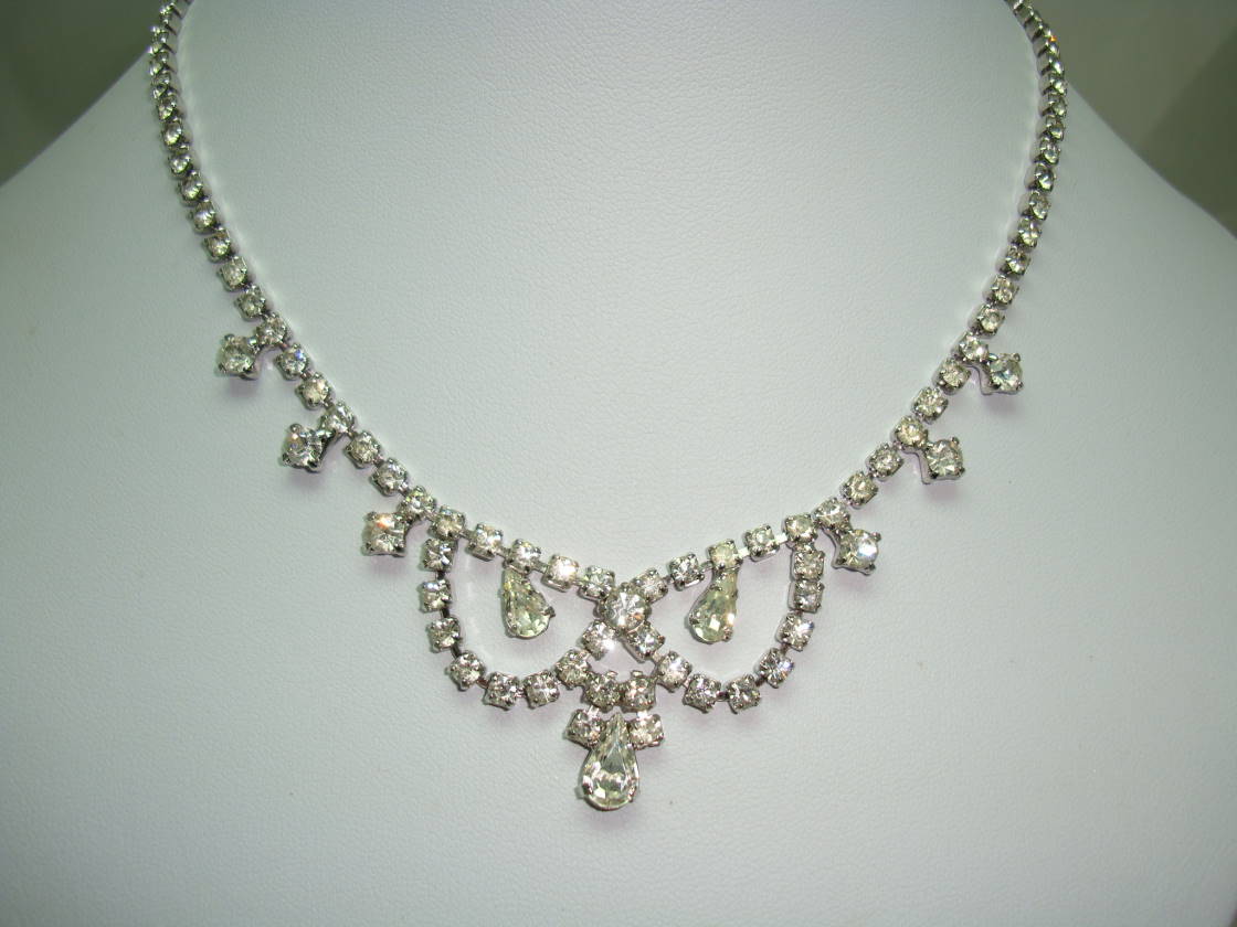 Vintage 50s  Glam Teardrop Shaped Diamante Scallop Drop Necklace