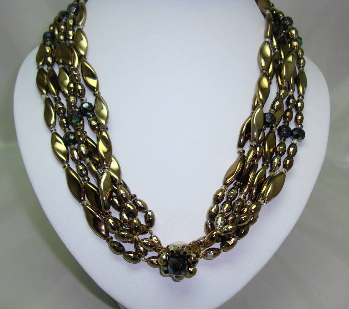 Vintage 50s 6 Row Gold & AB Glass Bead Twist Necklace Fab Flower Clasp