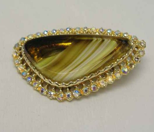 Vintage 50s Abstract Green Agate Glass Diamante Brooch