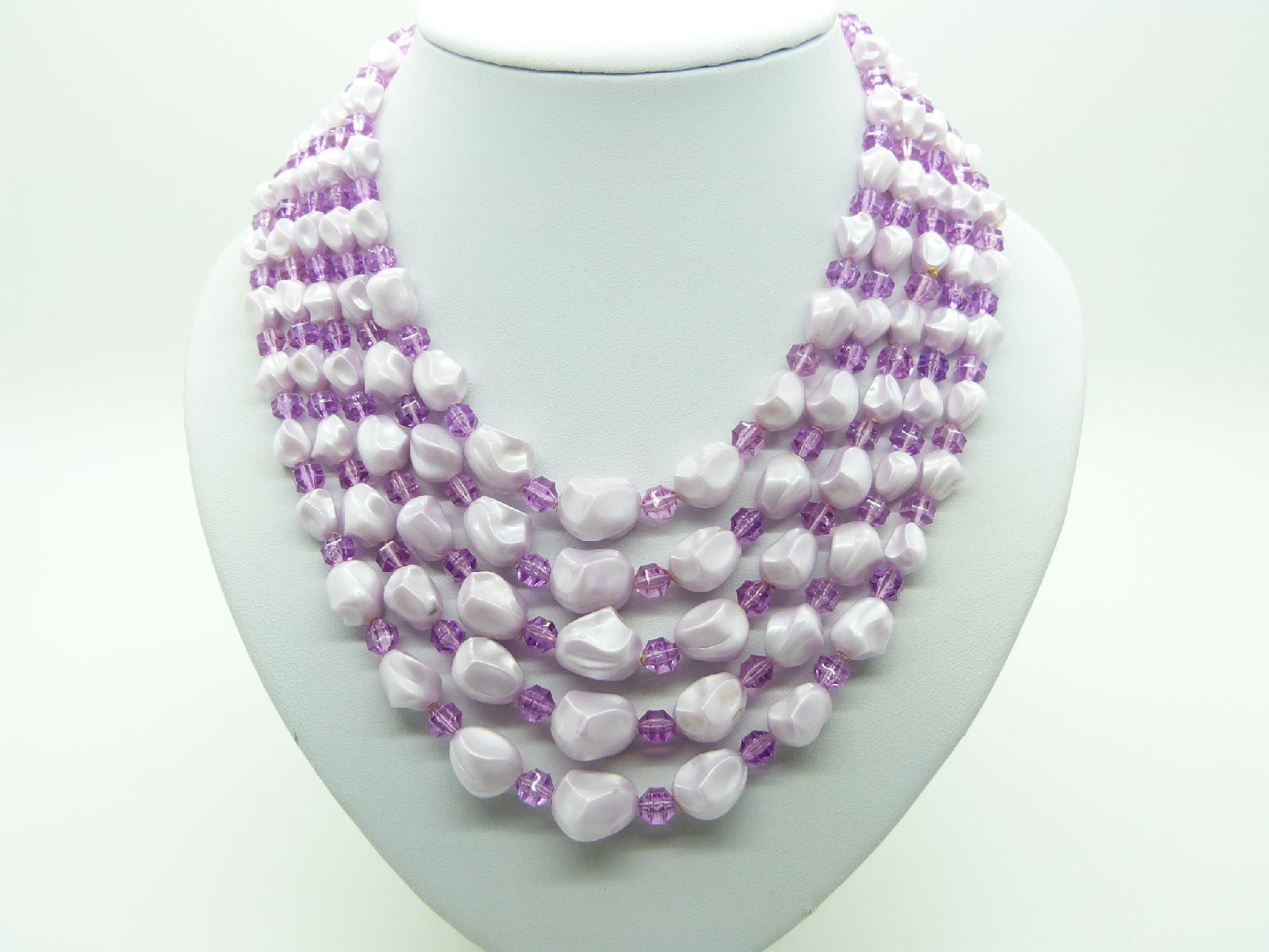 Stunning vintage 1950s five row graduating pink/lilac lucite/plastic textured bead necklace which is in mint condition.  Looks amazing on, a really show stopper, measures 45cms (longest row) with 6cms extender chain.