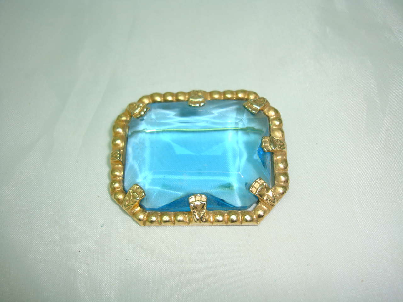 Vintage 50s Big Turquoise Blue Faceted Glass Stone Gold Brooch Signed!