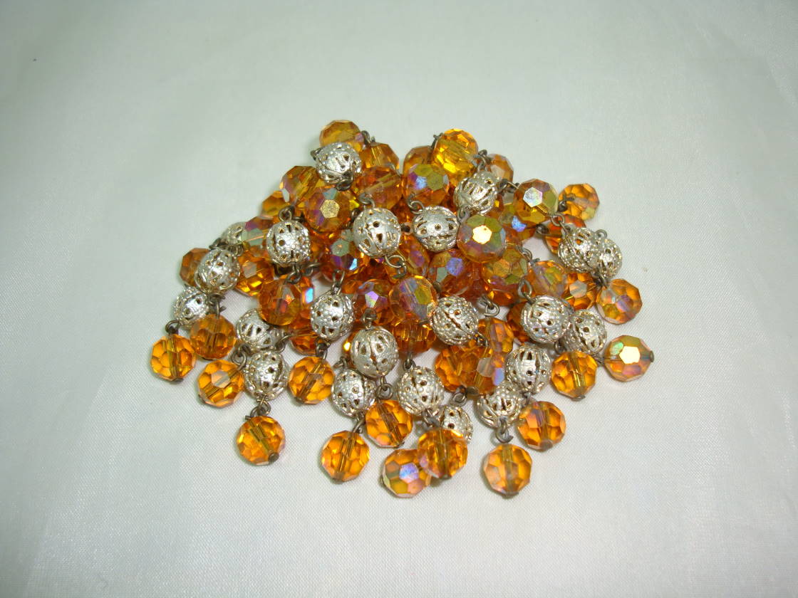 We are pleased to offer this amazing vintage 1950s citrine coloured glass bead and silvertone filigree bead tassel cascade brooch which is just fabulous.  Excellent vintage condition, looks stunning on,, a real eye catcher!  A very well made, quality vintage brooch.