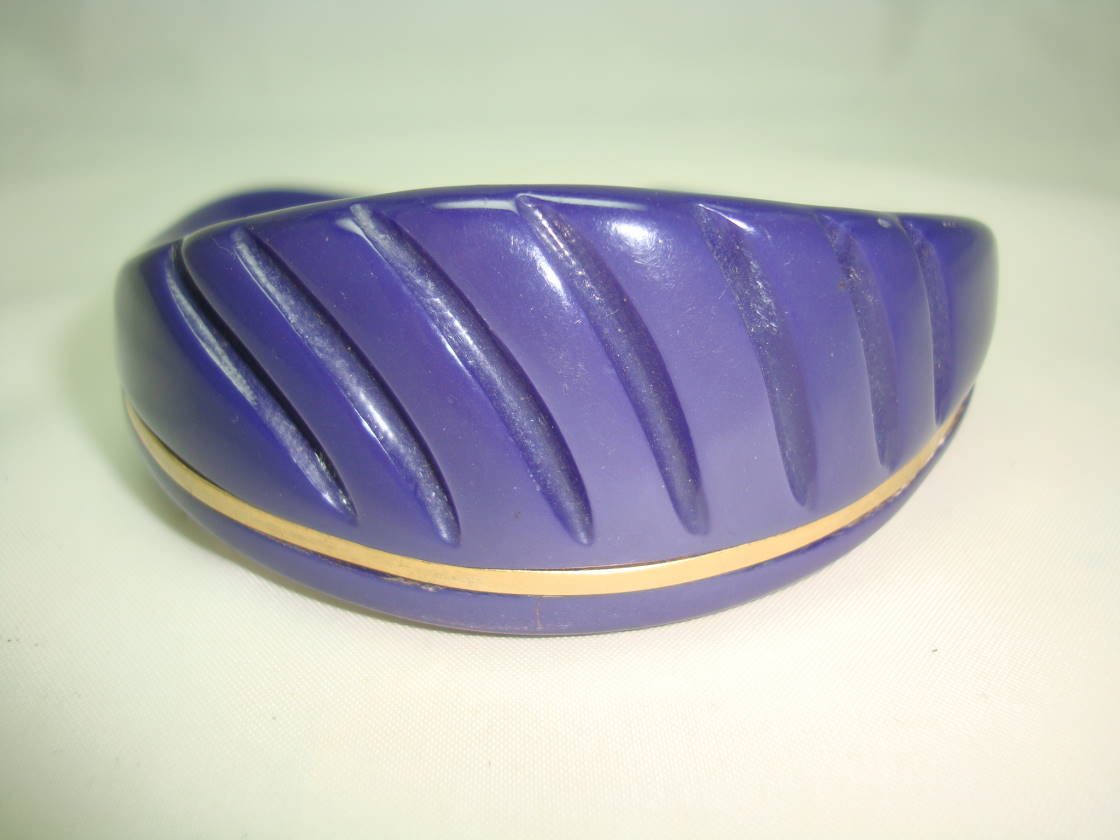 Vintage 50s unusual purple curvy moonglow lucite carved bangle with goldtone wire through top of bangle.  Excellent condition, very unique and eye catching.  Looks super on!