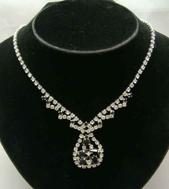 Stunning vintage 1950s sparkling diamante pendant drop necklace which is just stunning. As you can see the necklace looks very pretty on and looks like the real thing, great sparkle and shine. The necklace is made up of black and clear diamantes and the centre features a fabulous pendant incorporated into the necklace.  Pendant measures 2" x 1".  Excellent condition, all stones intact, a great vintage necklace.