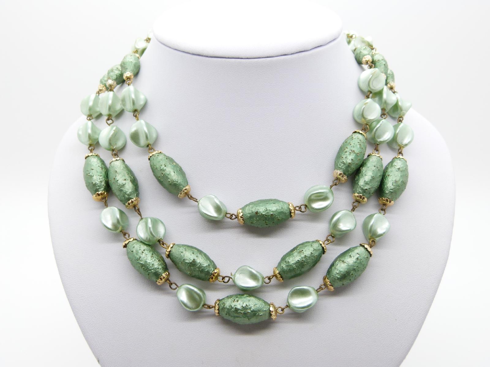 Vintage 50s Fab Three Row Two Tone Green Textured Lucite Bead Necklace