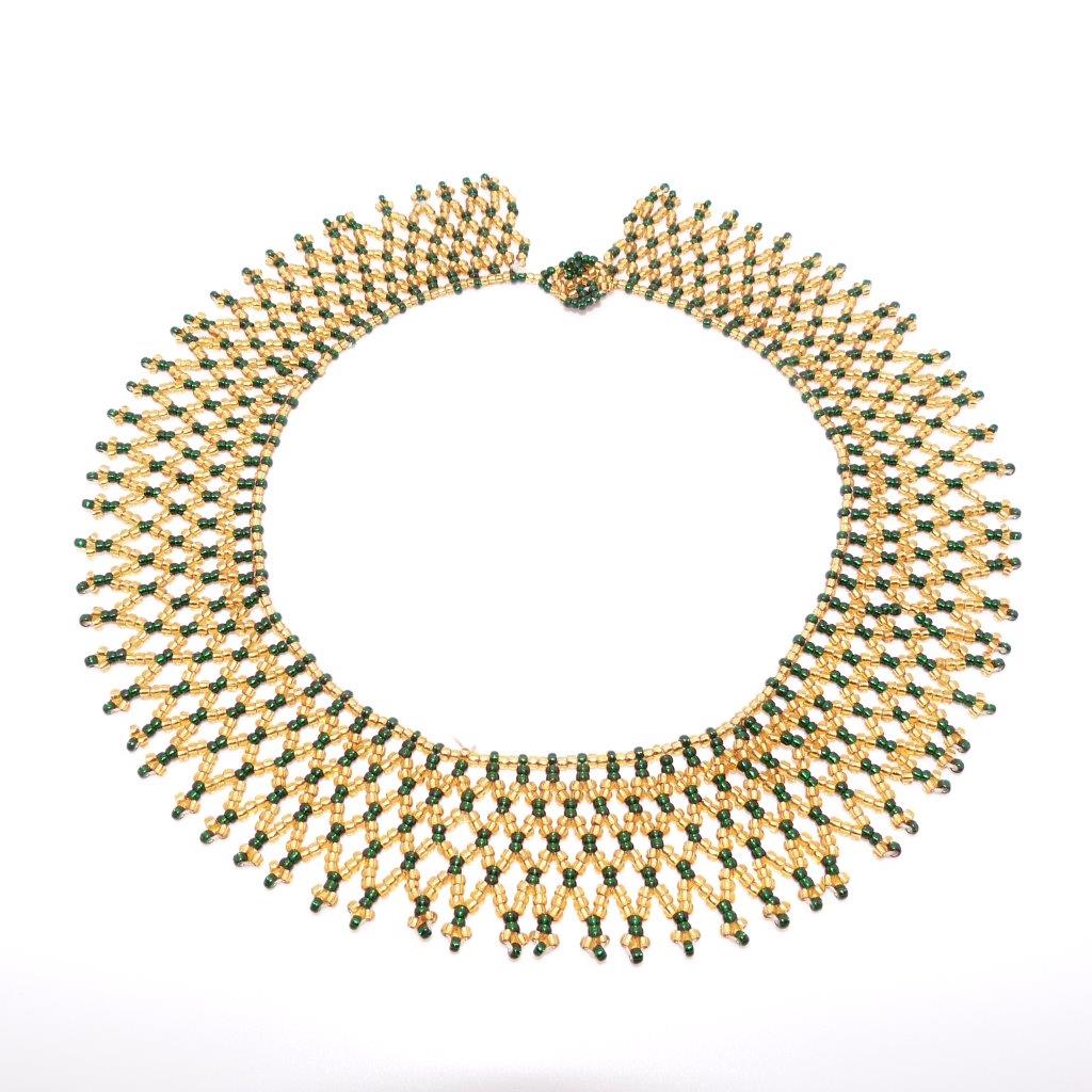 Stunning vintage 50s green and gold wide glass bead collarette necklace - fab condition, looks amazing on. Very Egyptian revival in style - would look great with a little black dress!