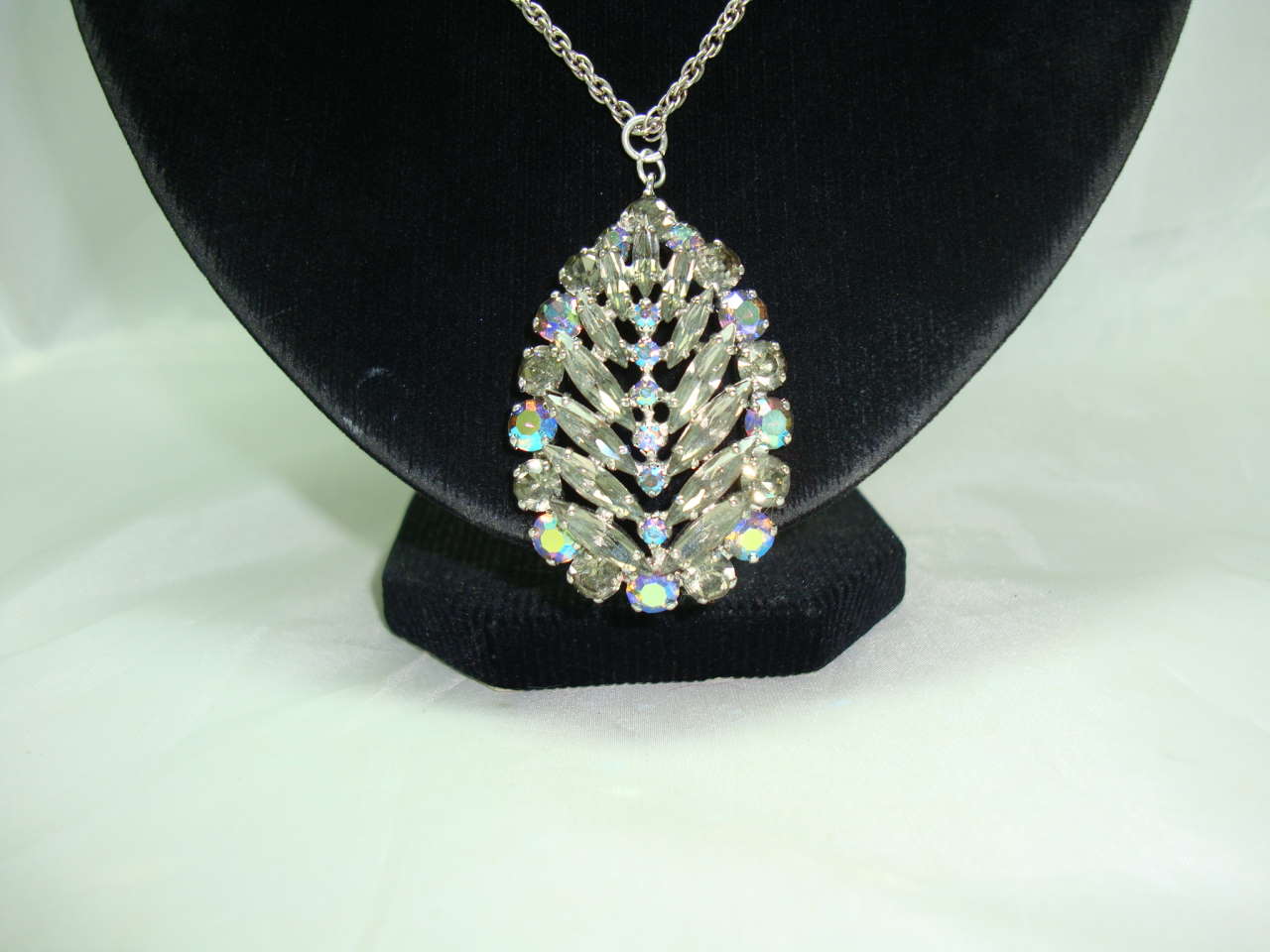 We are pleased to offer this quality vintage 1950s large ab diamante teardrop shaped silvertone pendant on silvertone chain.  As you can see from the photos, the pendant is in excellent condition and looks amazing on.  Great sparkle and shine from the ab rhinestone diamantes - a great quality vintage piece.