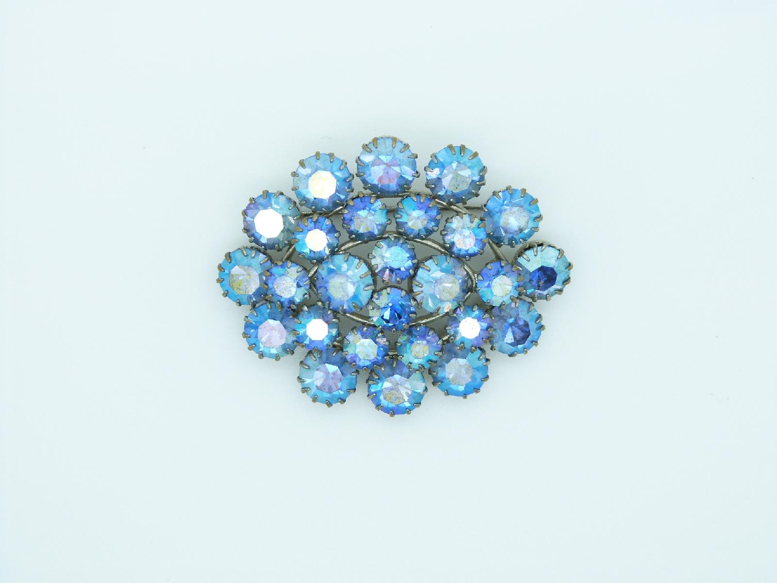 Fab vintage 1950s large oval silvertone brooch set with sparkling blue AB diamante stones, excellent condition, looks stunning on!  Measures 6cms across.