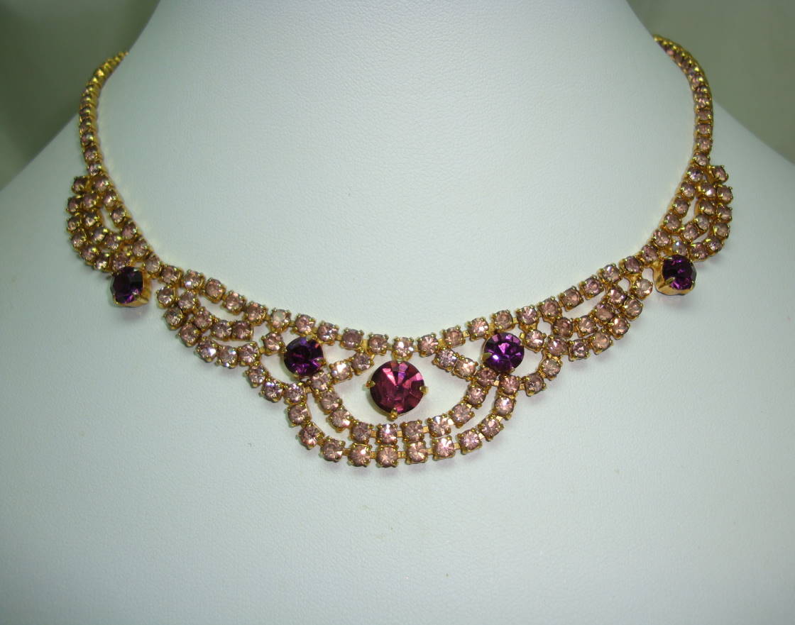 I am pleased to offer this pretty vintage 1950s pink and purple diamante/paste goldtone swag drop cascade necklace. As you can see from the photos,the necklace is in very good vintage condition, all stones clawed and intact, looks very glamorous on.