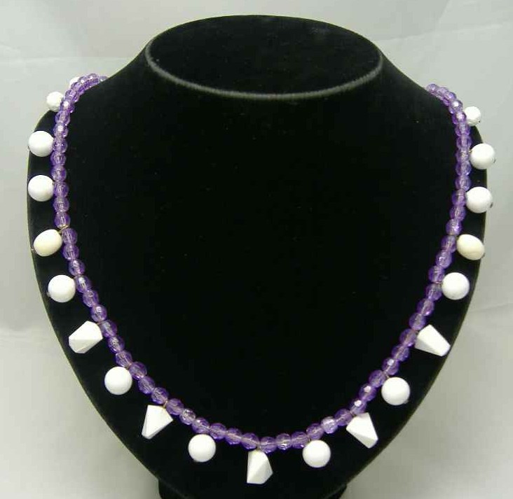 Vintage 50s Purple Lucite & White Bead Drop Necklace